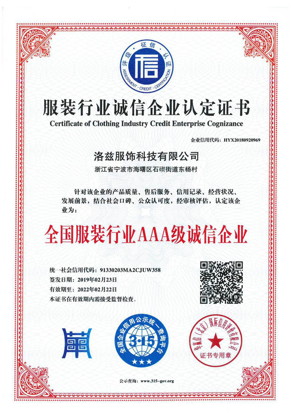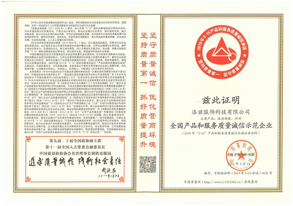 - 服装行业诚信企业认定证书
