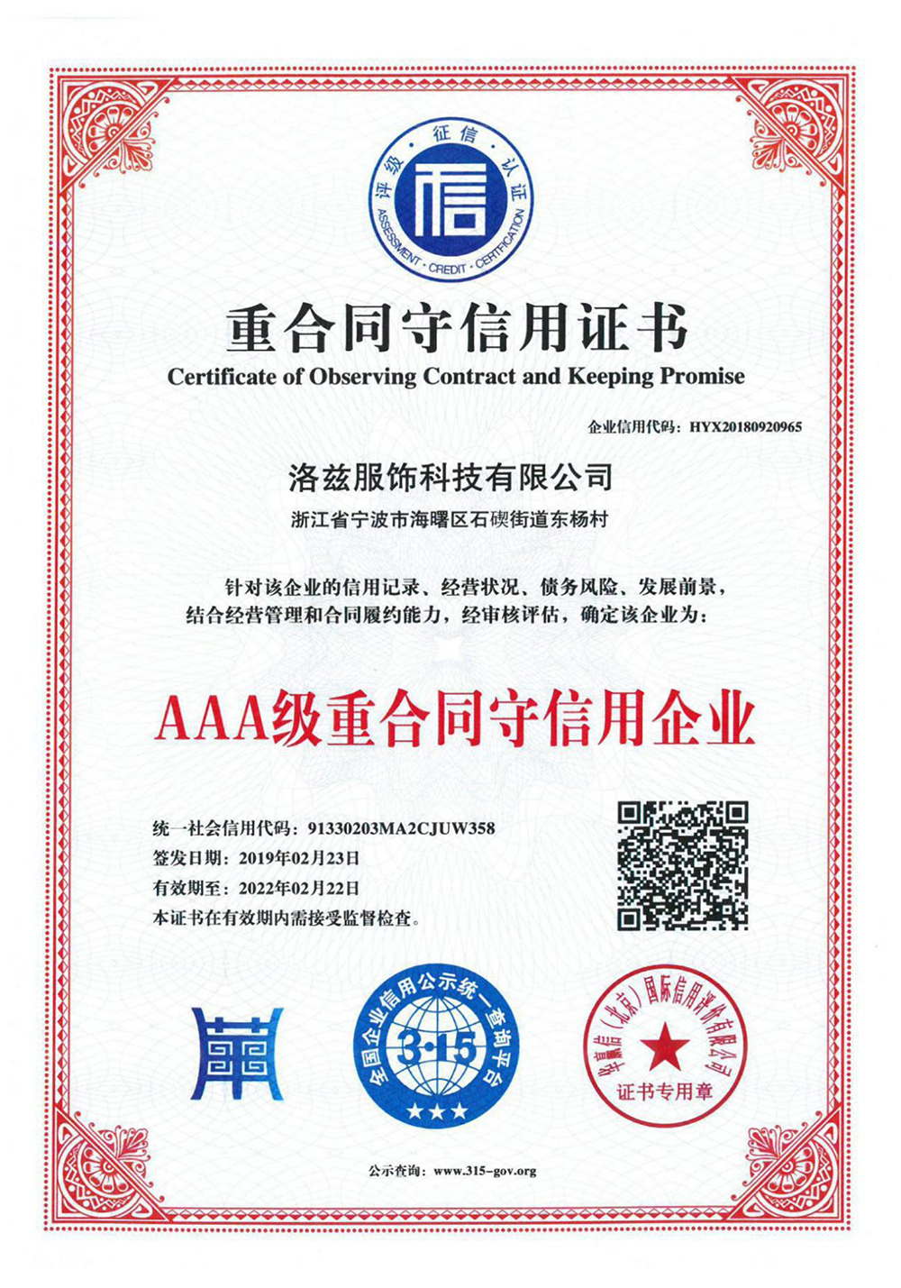 - AAA企业信用等级证书